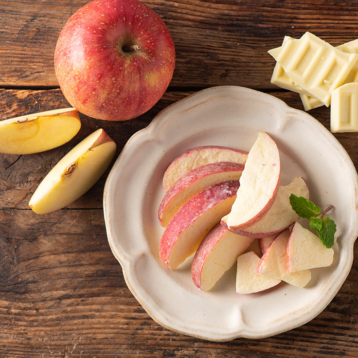 リンゴの風味がそのまま感じられるように、くし形と扇形の2種類のカットを採用。見た目はリンゴのようでありながら、味はチョコレートの不思議な菓子に仕上げられており、ホワイトチョコの甘みの後にリンゴの甘酸っぱさが爽やかに感じられる。