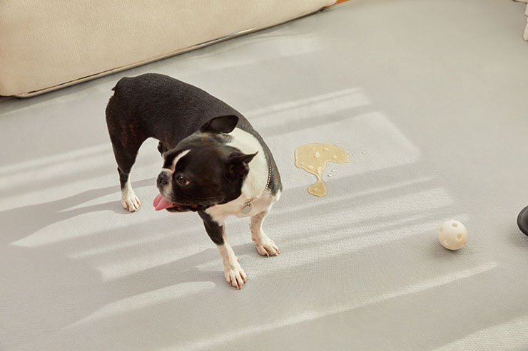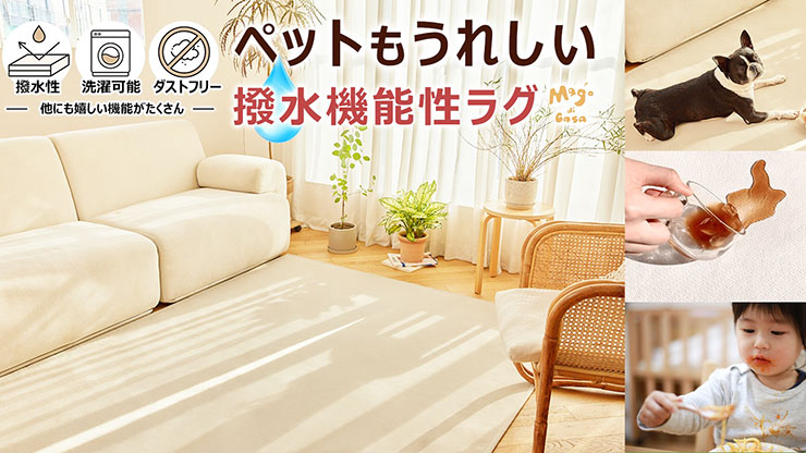 「Revolution Rug」は、ドリンクなどをこぼしても安心な撥水ラグ。裏地を滑り止め仕様にすることで、使用中にズレることを防ぐだけでなく、吸引力の高い掃除機での掃除がしやすい。製作工程の最後に高温スチーム処理を施しているので、綺麗な状態で届き、安心して使用できる。
