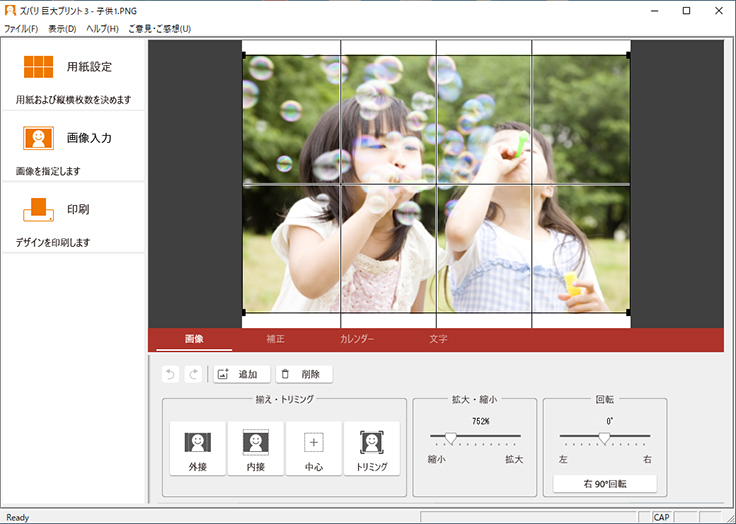 本ソフトは、株式会社市川ソフトラボラトリーの開発による「iFポスターメイカー」をベースに、一部仕様を変更。家庭用のA4プリンタでも、A2判やA1判などの“対応サイズを超えた拡大プリント”を実現するためのソフトだ。糊しろも含めて複数枚の用紙に自動で分割し、出力後に貼り合わせて完成させる仕組み。写真などを拡大出力しても、画質の劣化を抑えてキレイに仕上がる。