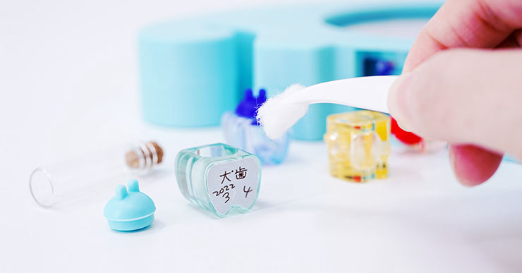「アンジュスマイル 乳歯ケース」は、抜けた乳歯をケースに入れてインテリアになる。生え変わりで抜けた子どもの歯を成長の証として記念に残せるケース。乳歯ケースは20個あるので、抜けた乳歯をすべて個別に保管できる。付属のシールには抜けた日付や一言などを記入しておくことができるので、より多くの思い出を残せる。小さなガラス瓶にはうぶ毛や、へその尾を保管可能。