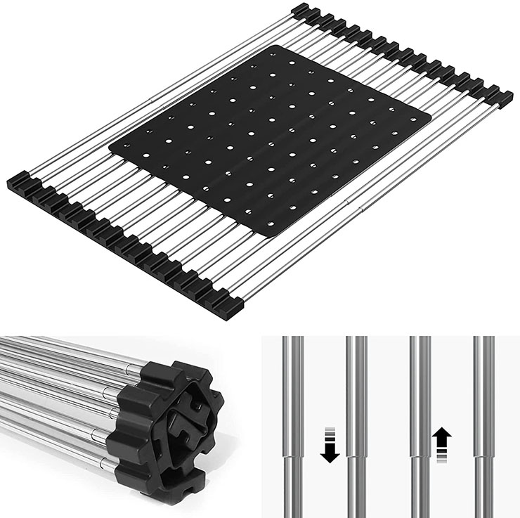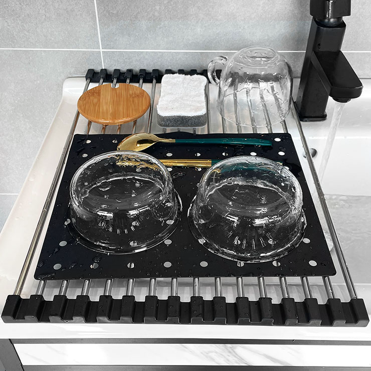 「川の信芸 水切りラック」は、折りたたんでコンパクトに収納可能。ステンレス棒の長さは調節できるので、シンクの幅に合わせて使える両端には四角い形状のシリコンキャップが付いているので安定して設置できる。水切り穴付きのシリコンマットが敷かれているので、食器が滑るのを防ぎ、水切れもしやすい。