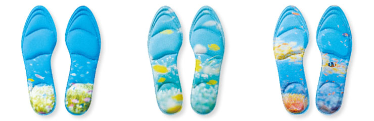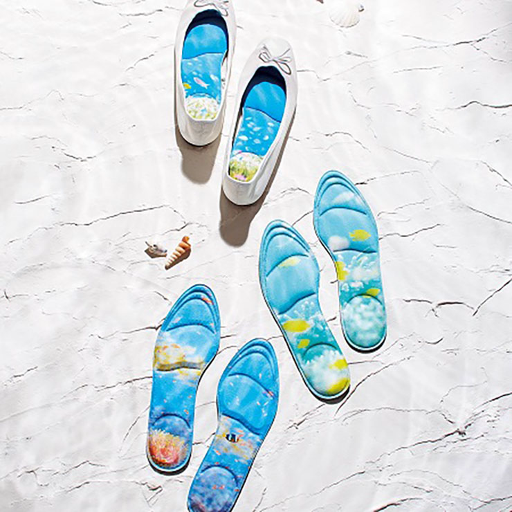 「海に足をひたす気持ちで靴を履く消臭インソール」は、消臭効果を備えたアイテム。活性炭シートや歩行を支えるクッションなど、快適に使える機能性にこだわっている。デザインには水中写真家・鍵井靖章さんが撮影した海の写真を使用しており、豊かな色彩を楽しめる。靴のサイズに合わせてカットして使うこともできる。