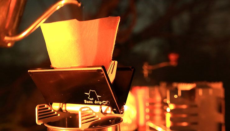 「Beaudrip(ボウドリップ)」は、軽量で薄型のドリッパー。名刺ケースのように薄いだけでなく、アルミ製で軽量なので持ち運びがしやすい。開くとコーヒーフィルターがフィットする形状で、台形の紙フィルターを利用可能。コーヒーが落ちる先端部分は、カリタ製の三つ穴式を採用している。表面にアルマイト処理を施しているので、本体と部品を細かな傷から守る。