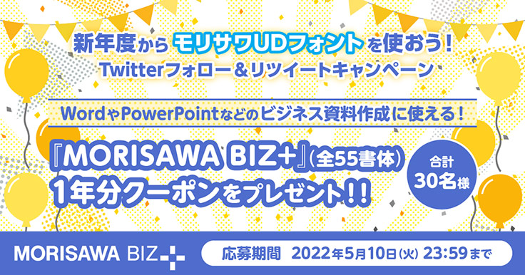株式会社モリサワは、“新年度からモリサワUDフォントを使おう!Twitterフォロー&リツイートで「MORISAWA BIZ+」が使える電子クーポン1年分プレゼントキャンペーン”を開始した。ユニバーサルデザインの考えに基づいた「UDフォント」を知ってもらい、使ってもらうことを目的としたキャンペーンで、実施期間は2022年5月10日(火)の23:59まで。応募者の中から30名に「MORISAWA BIZ+」の電子クーポン1年分(3,960円相当)が当たる。
