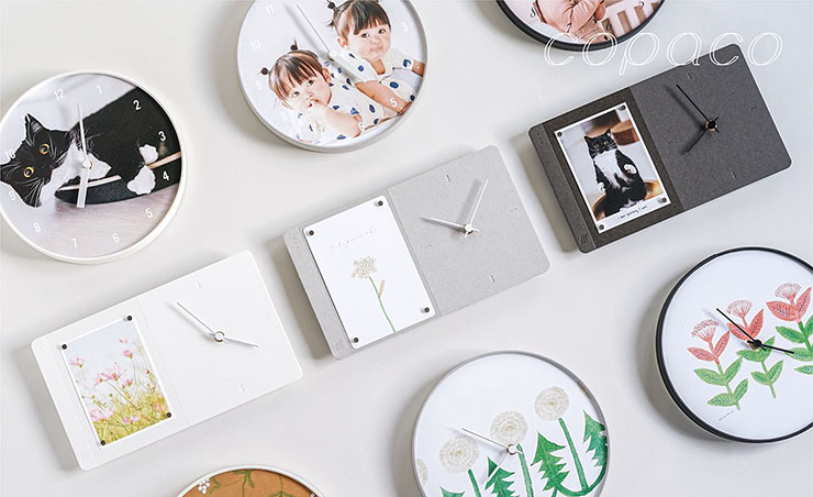 「copaco(コパコ)」は、「わたしだけの掛け時計」と「わたしによりそう置き時計」を取り扱う。掛け時計は、高級印刷用紙(印刷面)、約1.5mmの厚みを持つチップボール(盤面下地)、紙らしい柔らかな風合いが特徴のファインペーパーと板紙の貼合紙(フレーム)の3種で構成されている。置き時計は、厚さ1.5mmのファインペーパーとチップボールを交互に5枚貼り合わせ、紙ならではの風合いはそのままに、木板のような強度を持たせている。