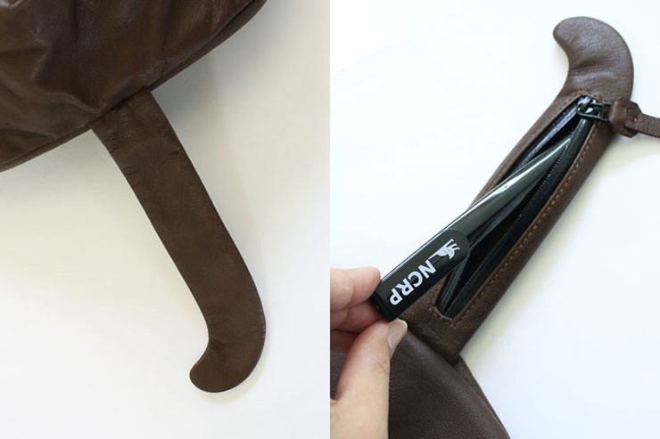 「WATER PROOF CAT BACK PACK(ウォータープルーフキャットバックパック)」は、上部に猫耳、下部にはしっぽが付いている。耳の右側は「さくら耳」になっており、さりげなく猫助けをアピールできるしっぽ部分はファスナー付きで、ペンなどを収納可能。背負ったまま荷物を取り出しできる背面ポケットを搭載している。なめし段階において革の深層部にまで防水加工を施している。