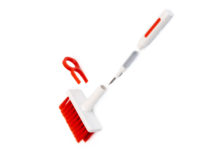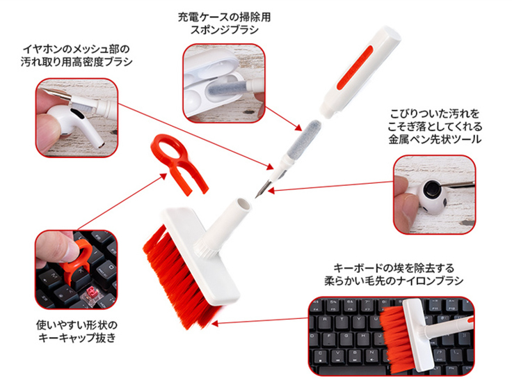 本商品では、柔らかい毛先のナイロンブラシと使いやすい形状のキーキャップ抜きを使って、キーボードに溜まった埃を除去することが可能。ブラシの“柄”にイヤホンクリーニングツールが内蔵されており、ワイヤレスイヤホンの本体や充電ケースの細部の掃除にも活用できる。