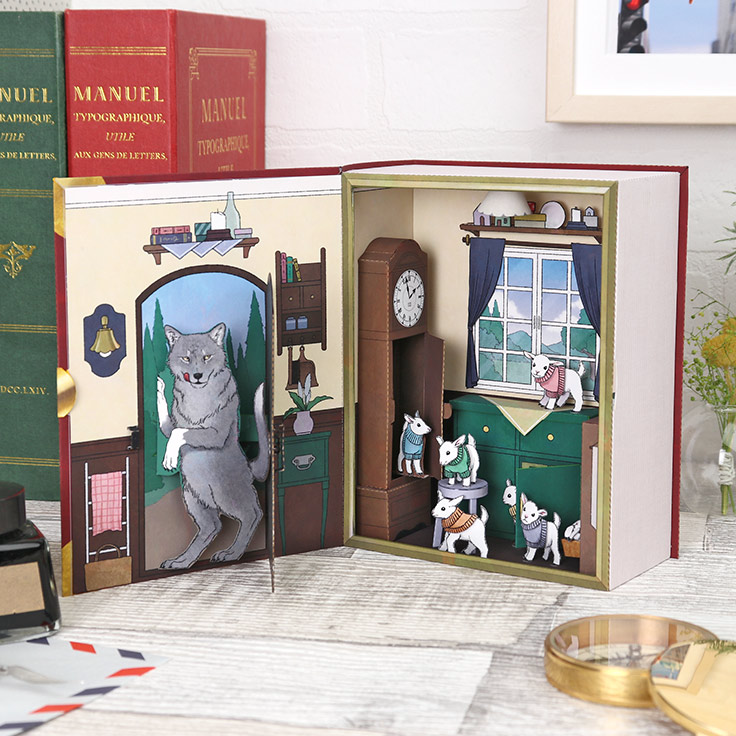 アンティークな洋書デザインの「ジオラマブック(おおかみと七匹の子やぎ)」は、