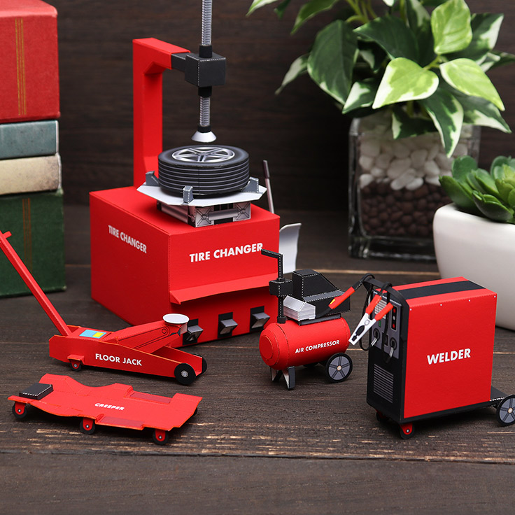 一例として、「ミニチュア撮影小物セット」は、カメラやストロボなどの撮影道具をセットにしたミニサイズのペーパークラフト。そのほか、タイヤチェンジャーやフロアジャッキなどの整備道具が揃った「ミニカージオラマ(整備道具セット)」や、作業台と椅子まで付いた「ミニチュア工具セット」なども登場した。