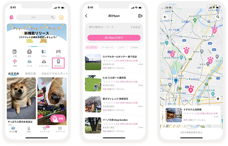 株式会社NGAは、ペット総合アプリ「Pet」内に、ペットと遊べる施設を紹介する「遊びSpot」チャンネルを新設した。ドッグランをはじめ、ペットと同伴が可能なテーマパークやレジャースポットやホテルなど、さまざまな施設を紹介。掲載施設は今後も随時に増やされる予定で、掲載希望の施設による申し込みも受け付けている。