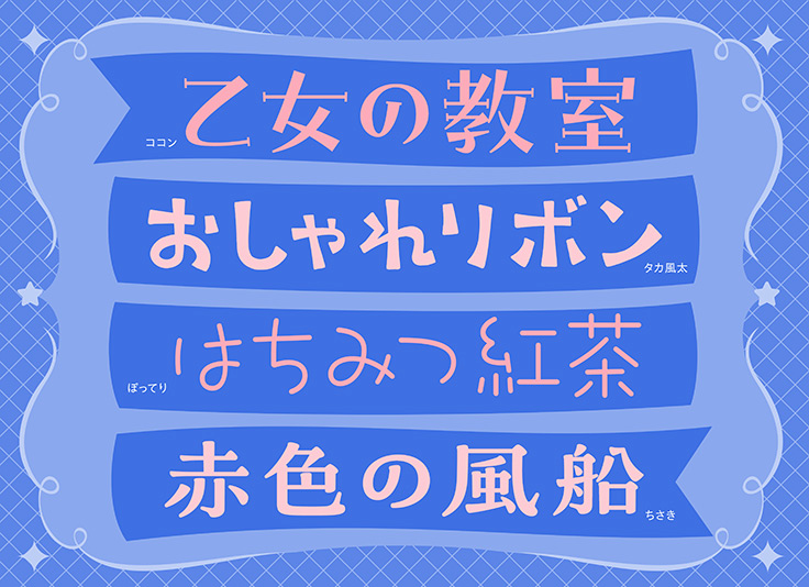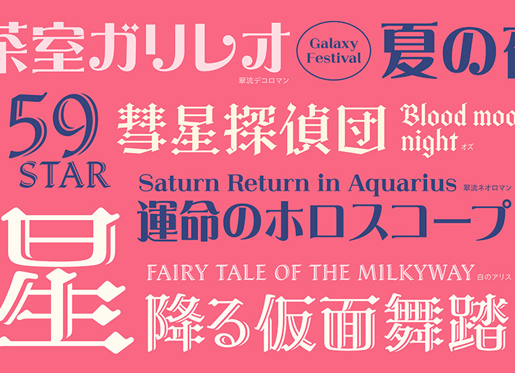 「ロマン」のジャンルは、レトロかつ華やかな印象の書体のラインナップ。やや低めの重心を持つスクエアな骨格の漢字を共通としたハイコントラストな書体「翠流ネオロマン」「翠流デコロマン」に加え、人気のかな書体に漢字を追加した「白のアリス」「オズ」も登場し、計4ファミリーとなる。