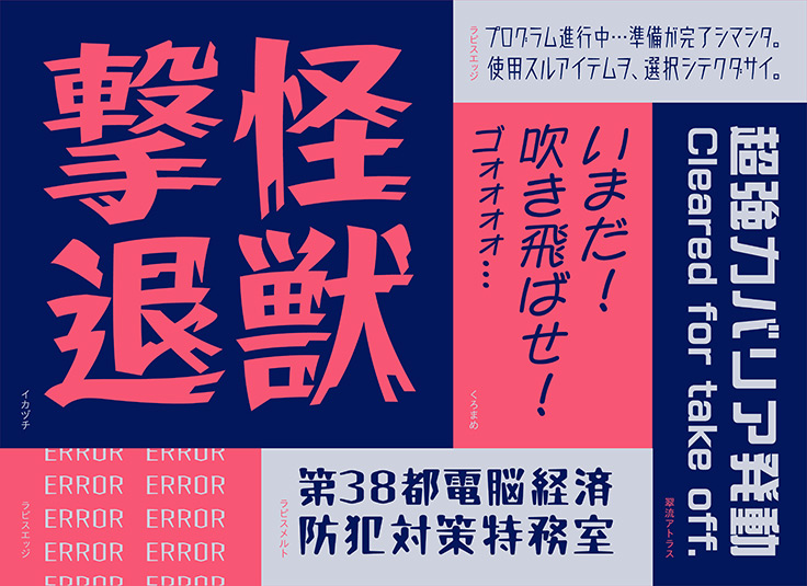 「インパクト」のジャンルには、字面が大きめで迫力を感じさせる書体が揃う。雷鳴で割れたような端々の装飾が特徴的な「イカズチ」をはじめ、「ラピスエッジ」「ラピスメルト」など5ファミリーをラインナップ。ゲームやコミックなど、コンテンツの世界観を演出するシーンで使いやすい。
