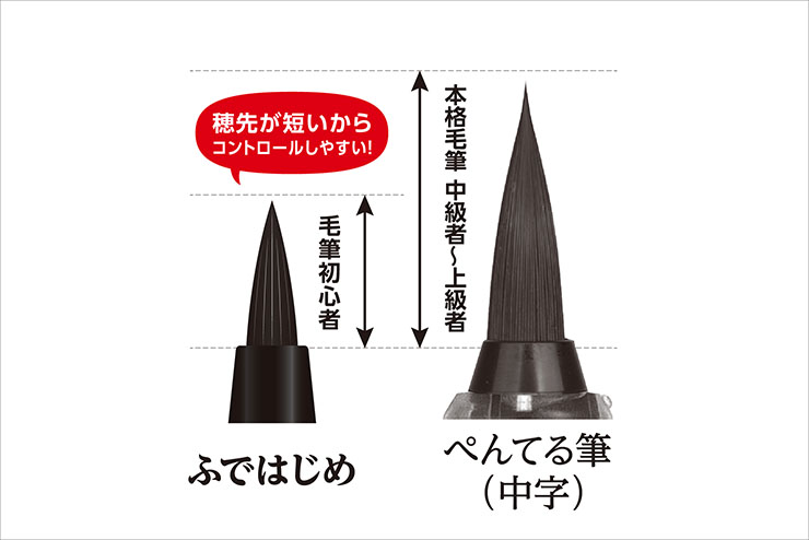 「ぺんてる筆 ふではじめ」は、小回りが利く、毛筆初心者用の筆ペン。穂先にインキを浸透させたり、インキの量を調整したりする手間がかからないので気軽に使用可能。開封後キャップを外したらすぐに書き始められる。穂先は本格毛筆よりも短い設計で、毛筆初心者でも使いやすいようほどよいサイズとなっている。