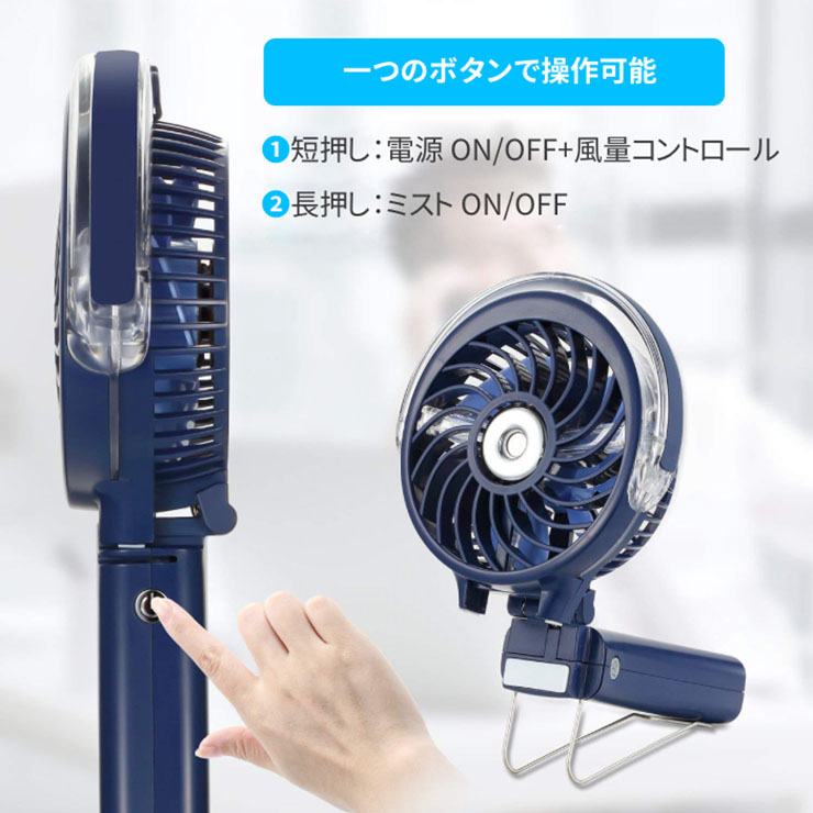 「コールドミストハンディーファン」は、6枚羽で風量3段階式。電源スイッチを押すごとに風量が切り替わり、「リズム風」「弱」「中」「強」「OFF」を使い分けられる。リズム風は5秒ごとに運転と停止を繰り返す。扇風機作動中に2回早押しをすると、電源をOFFにできる。電源スイッチを3秒間長押しすると、ミスト機能のON/OFFが切り替わる。