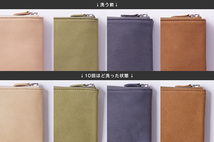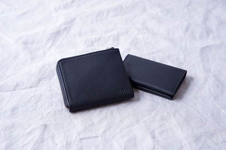 「Wole(ウォーレ)」は、洗っても本革の質感が損なわれないウォッシャブルレザー。財布は洗える革財布としての機能性を保ち破損やシワを防ぐことを考慮し、強度を保つために芯材は使用せず通常の2倍の本革を使用し二重構造となっている。カードケースは片手に収まるコンパクトサイズ。