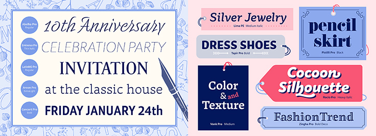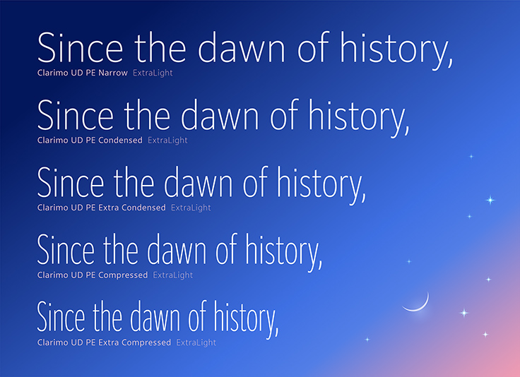 ほかにも、有機的なデザインや見出しに使いやすいインパクトの強さが特徴的な「オーガニック&ディスプレイ」ジャンルで12ファミリー、上品さを感じさせる伝統的なスタイルや汎用性の高さが特徴的な「クラシカル&スタンダード」ジャンルで20ファミリーが追加される予定。さらに、「Clarimo UDシリーズ」から「Clarimo UD PE」のコンデンス書体が5段階の長体率で登場することが予告されている。