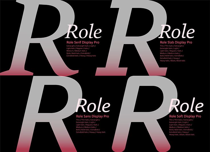 「Roleスーパーファミリー」の核となるイメージは“誠実さ”や“安定感”で、コーポレートアイデンティティーの制作などにも最適。Serif、Sans、Slab、Softの4つのスタイルと、Text(本文用)、Display(小見出し用)、Banner(大見出し用)の3つのサイズシーンを持つ書体群として構成されている。