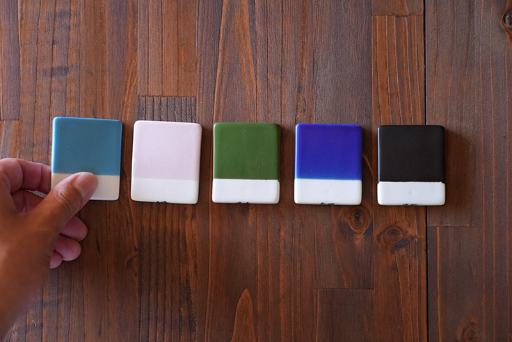 注文の際には、まず最初に100色の中から5色を選択。すると、その色見本タイルが届く。これは、スマートフォンやパソコンの画面上では分からない微妙な色の違いや質感を、実物の見本で確認してもらうための工夫。最終的に好みの1色を決めると、選んだ色の食器が届く。