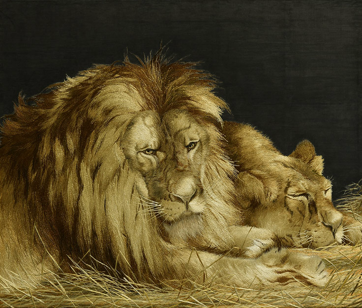 本展には、100年を超えて日本へ“里帰り”した「獅子図」をはじめ、髙島屋史料館、清水三年坂美術館、株式会社千總、有限会社青木刺繍などが所蔵する美しい「刺繍絵画」の作品群が登場。髙島屋が1900年パリ万博などに出品した染織作品の下絵のほか、数々の貴重な資料も紹介されている。