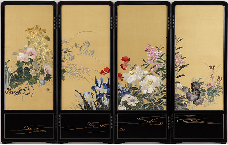 「刺繍絵画」とは、日本画家が描いた下絵をもとに、刺繍職人が針と糸で縫い上げた作品のこと。主に明治・大正時代を中心に、邸宅を彩る室内装飾品として壁掛や衝立などに多く見られた。