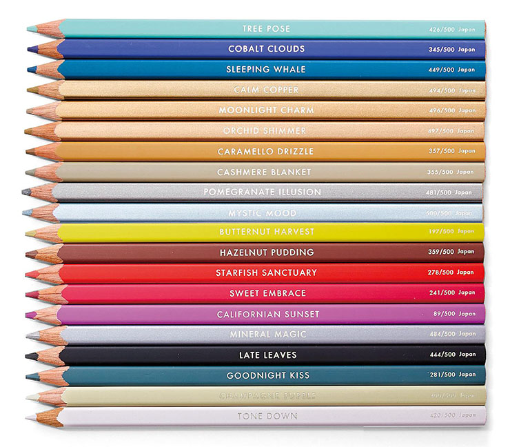 「クリムトの世界に魅了される 色えんぴつ 20/500 COLORED PENCILS」は、フェリシモの「500色の色えんぴつ」中から20色が選ばれている。特別感のあるメタリックカラーの色えんぴつも6本含んでいる。パッケージはクリムトの代表作「接吻」にゴールドカラーのフレームをあしらった豪華な仕様。