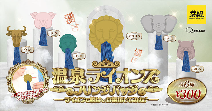 イエロー株式会社カプセルトイ事業部「黄組」は8月30日、「湧き湧き!温泉ライオンズ フリンジバッジ」の発売を発表した。銭湯などにある、口からお湯を吐くライオンがカプセルトイに。12月中旬より、300円で販売する。