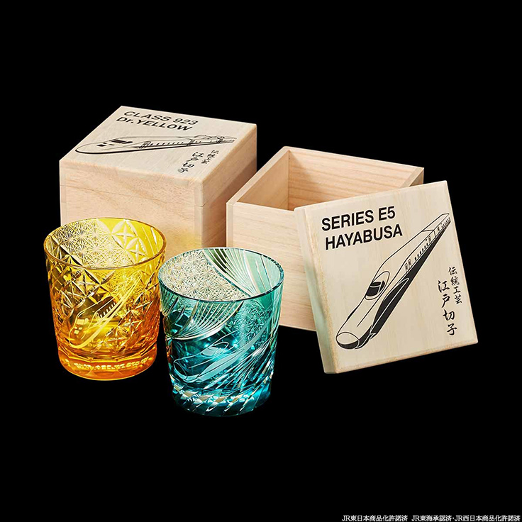 本商品は、JR東日本商品化許諾を得たうえで、東北新幹線E5系「はやぶさ」と、923形新幹線電気軌道総合試験車「ドクターイエロー」をイメージしてデザインされた。国の伝統的工芸品にも指定されている東京のガラス工芸「江戸切子」によって、光を透過する美しい表現のグラスとして完成。それぞれのモデルを2人の伝統工芸士が手掛けており、「E5系はやぶさ」を石塚春樹氏、「923形ドクターイエロー」を細小路圭氏が担当している。