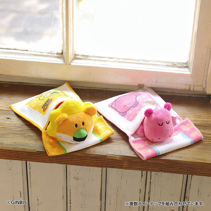 E賞はスナップボタン付きで「おねむりまくら」のカバーとしても使える「ふんわりタオル」。F賞の「タオルポーチ」も、タオルやポーチとして使えるだけでなく、「おててくつろぎまくら」や「おててくつろぎマスコット」の“布団”として、ぬいぐるみと一緒に使える。E賞とF賞には、各6種のバリエーションが用意された。