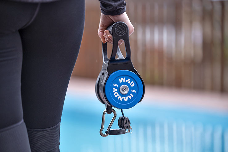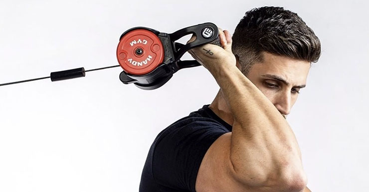 「Handy Gym」は、重量712gと小型軽量で持ち運び可能。NASA開発技術の「慣性トレーニング」を利用している。200種類以上のトレーニングが実践できる。最大100kg負荷に対応しており、負荷調整はディスクを変えるだけで行える。