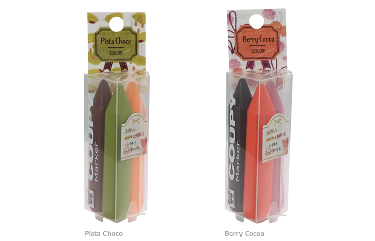 本体の軸は、指先にフィットしやすい太軸の三角形。今回、その可愛らしい「クーピー マーカー」の定番である「ミルキー」「ポップ」「レトロ」「キャンディ」「和モダン」のラインナップに、限定パッケージの「ピスタチョコカラー」と「ベリーココアカラー」が追加された。