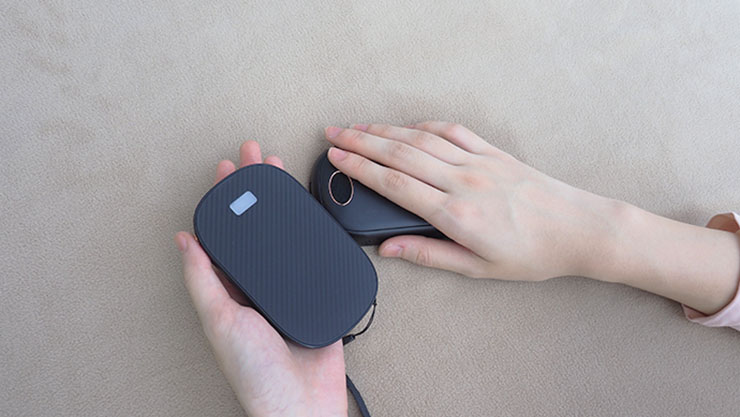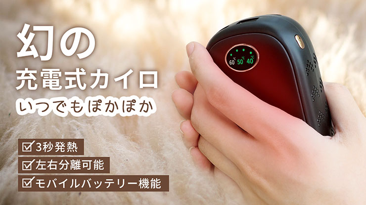 「多機能充電式カイロCaier」は、ボタンを押して3秒で発熱する。温度は3段階で調節でき、40度、50度、60度をボタン1つで切り替えることができる。磁気分離式デザインを採用しているので、左右の手を同時に温めることが可能。USB-AとUSB-Cの充電ポートを搭載している。