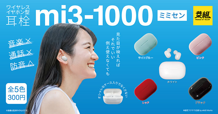 イエロー株式会社は10月7日、「ワイヤレスイヤホン型耳栓 mi3-1000」の発売を発表した。イヤホンの見た目をしたカプセルトイ。1月下旬より、300円(税込)で販売する。