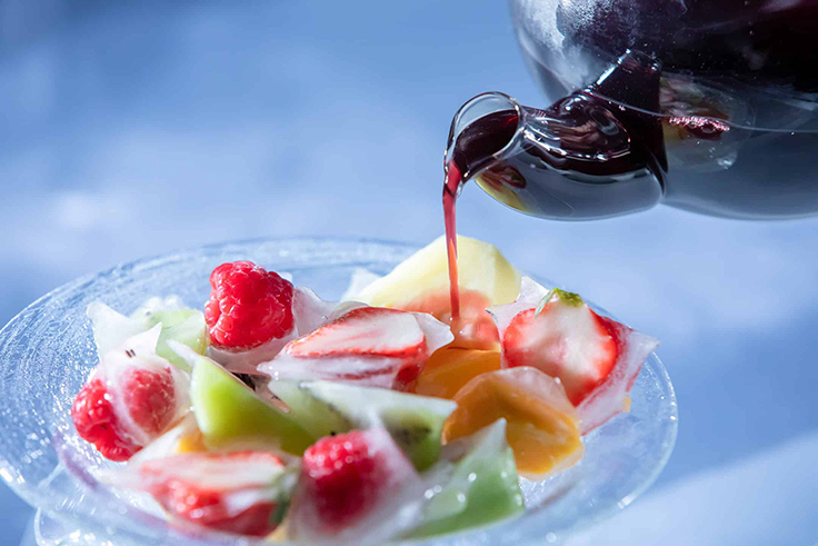 凍らせたフルーツにシナモンをきかせたホットワインをかけて味わうデザート