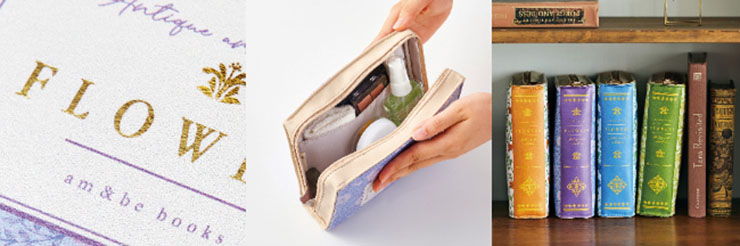 「アートブックのような洋書風ポーチ」は、アンティークフラワーデザインで本棚やキャビネットに並べるだけで絵になる。ごちゃつきやすいコード類や文房具、コスメなどをすっきりと収納できる。表紙の一部は箔押しとなっているので、きらりと輝く。ポーチの中は内ポケット付き。
