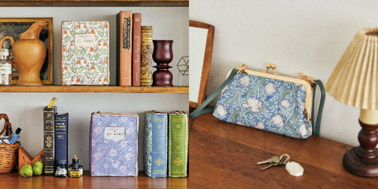「アートブックのような洋書風ポーチ」のサイズは縦約20cm×横約15cm×まち幅約5.5cm。また、落ち着きのあるアンティークフラワー柄にゴールドのがま口が上品なデザインの「スマホも入る ショルダー付きがま口ウォレットバッグ」も販売する。