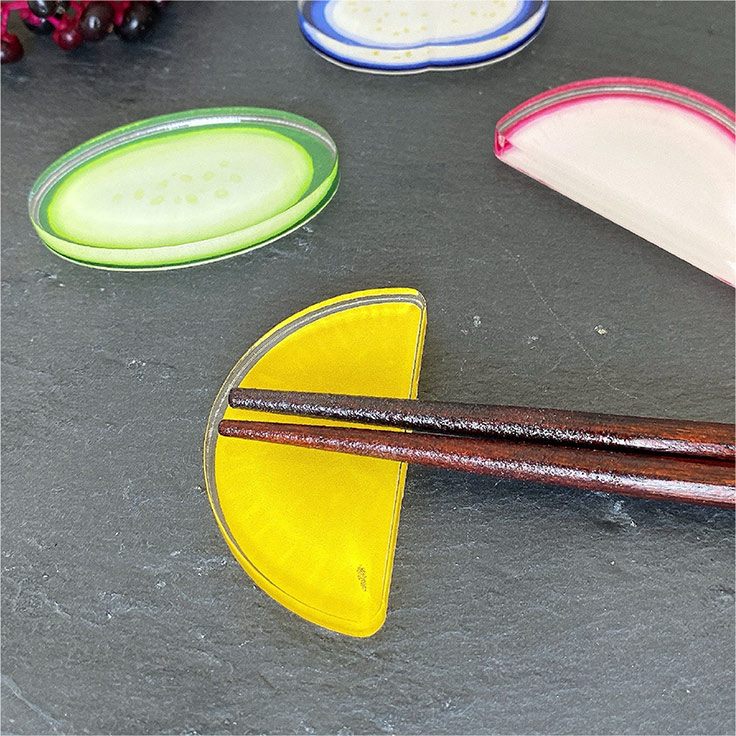 箸置きは、別途に4種類の漬物でデザインされたモデルを同梱した「おつけもの hashioki」という商品も販売。コースターと同じく5mm厚の透明アクリルが用いられており、1個のサイズは約48mmで、1,320円(税込)で販売されている。