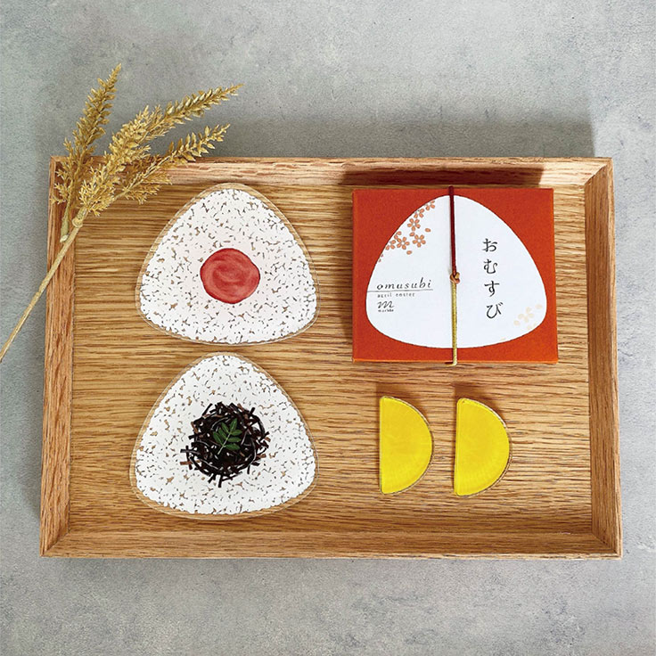 販売価格は各1,320円(税込)。ギフトに適したケース付きのセット商品「おむすびcoaster セット」もあり、2,310円(税込)で販売されている。このセットに同梱されている「おむすびcoaster」のモデルは梅と昆布。さらに、たくあんを模した箸置き2つも付属している。