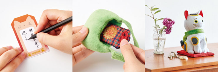 着脱可能なアイテムがセットになっており、風呂敷・縁起物がたくさん描かれた短冊・座布団が付属する。