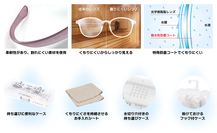「アイラブ入浴」は、ボスリントン型とスクエア型のクリアフレームで登場。軽量かつ柔軟なだけでなく、くもりにくい専用メガネなので、お風呂やサウナで快適に使用できる。付属品は専用ケースと曇り止めお手入れシートとなっている。