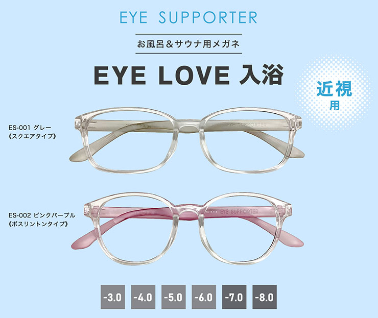 「アイラブ入浴」の度数は近視用ラインナップとして、「-3.0」「-4.0」「-5.0」「-6.0」「-7.0」「-8.0」を取り扱う。耐熱温度は80度から130度。