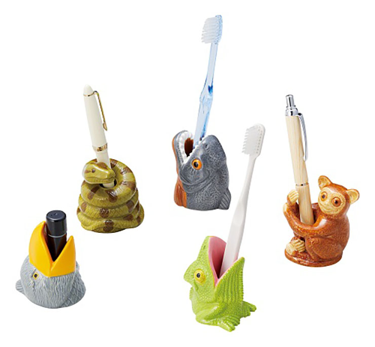 「【アニマル雑貨】歯ブラシスタンド」は、アマゾンの雰囲気がただよう動物たち。まるで獲物を捕獲するかのように、歯ブラシを捕らえる。歯ブラシだけでなく、ペンや印鑑スタンドにもなる。洗面台やデスク、玄関先などに置いておくことができる。日常に大自然の雰囲気を添えるユニークなアイテムだ。