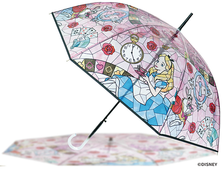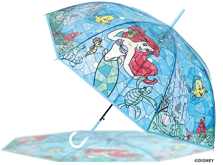 可愛いディズニープリンセスのイラストを採用することで、一般的に“使い捨て”の印象が強いビニール傘のイメージが変わるアイテム。雨をしのぐだけでなく、晴れの日にも持ちたくなるデザインで、晴れの日に使うと光が透過してまるで本物のステンドグラスのような美しい佇まいを楽しめる。