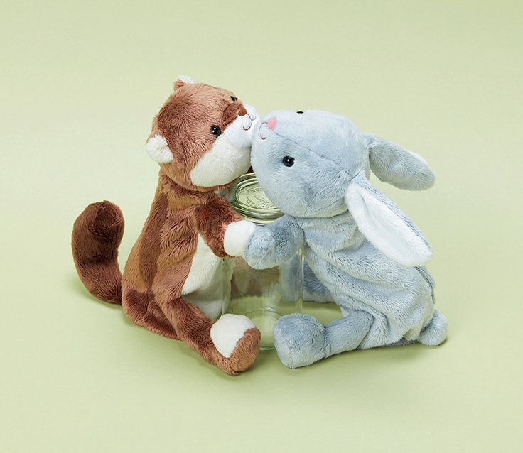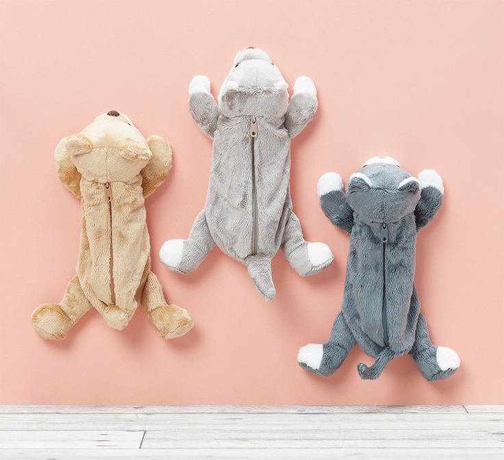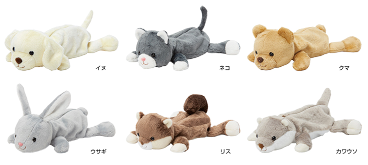 「マグネットタイプ」は、動物たちの両手の部分にマグネットを内蔵。金属製の壁や机などにくっつけることができ、「マグネットタイプ」の「nuimee」同士で手をつないだ状態にもできる。サイズは約240(幅)×90(高さ)×340(奥行)mmで、目安としては直径10mmのペンを20本ほど収納することが可能。デザインには、イヌ、ネコ、クマ、ウサギ、リス、カワウソがある。