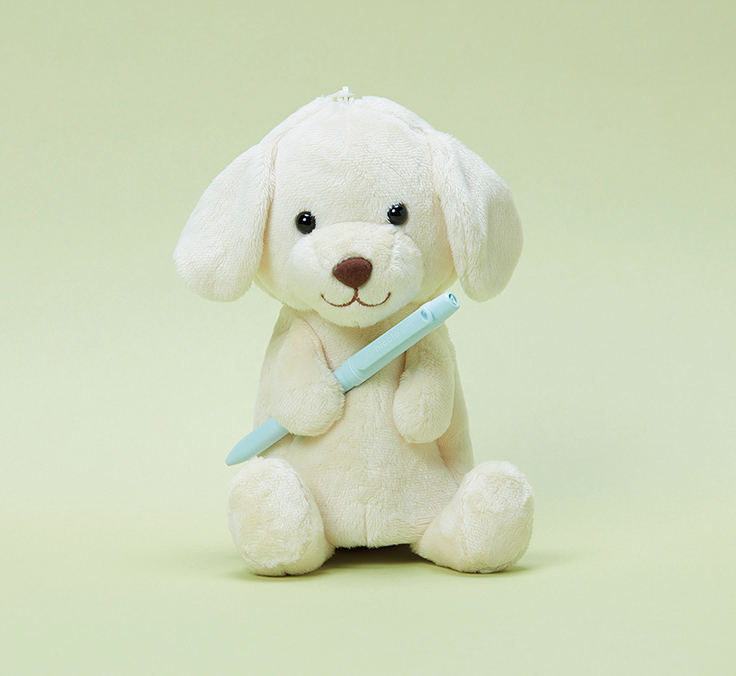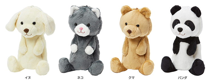 「おすわりタイプ」のラインナップは、イヌ、ネコ、クマ、パンダ。「おすわりタイプ」は自立式の構造で、机の上に可愛く座らせておくことができる。手には“推し”のペンを持たせることが可能。サイズは約150(幅)×220(高さ)×190(奥行)mmで、目安として直径10mmのペンを15本ほど収納できる。