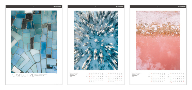 東洋インキグループの「PERSPECTIVE」が受賞した第1部門は「企業・団体に配布するBtoB向け企業カレンダー」。作中ではトビアス・ヘッグ氏のドローンによる空撮写真が用いられており、「ほぼ垂直に見下ろす視点」で撮影された大胆な構図の写真によって、大自然の美しさや雄大さが強く印象に残るデザインに仕上げられている。