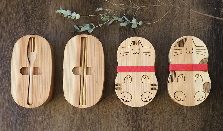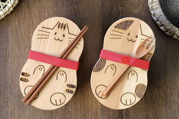 タイプは2種類で、「日本の弁当箱」「わっぱ弁当箱」を展開。ラインナップはそれぞれ2種類あり、「日本の弁当箱」からは「ブチ」「トラ」、「わっぱ弁当箱」からは「フォークセット」「箸セット」を取り扱う。