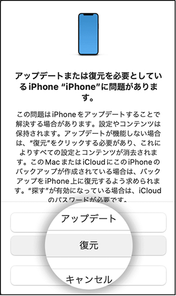iPhoneに「リカバリモード」の画面が表示されたら、指は離してOK。あとはパソコン上のiTunesでiPhoneを選択し「復元」を実行する。MacであればFinderでも復元ができる。