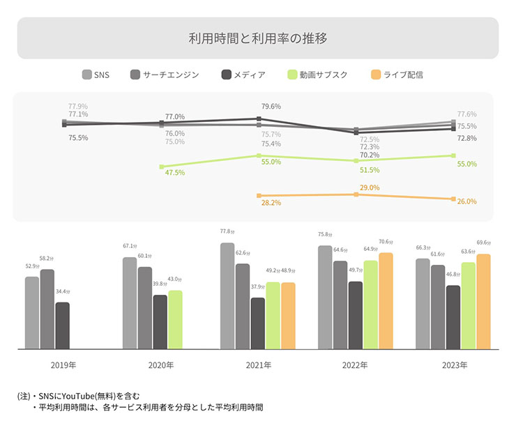 2021年以前に調査した「SNS」、「サーチエンジン」、「メディア」の3分類に加えて、「動画サブスク」、「ライブ配信」を含めた5分類のサービス利用状況を調査。2022年から2023年にかけて、これら5分類合計の1日の平均利用時間は「190.3分」から「185.2分」へと減少した。