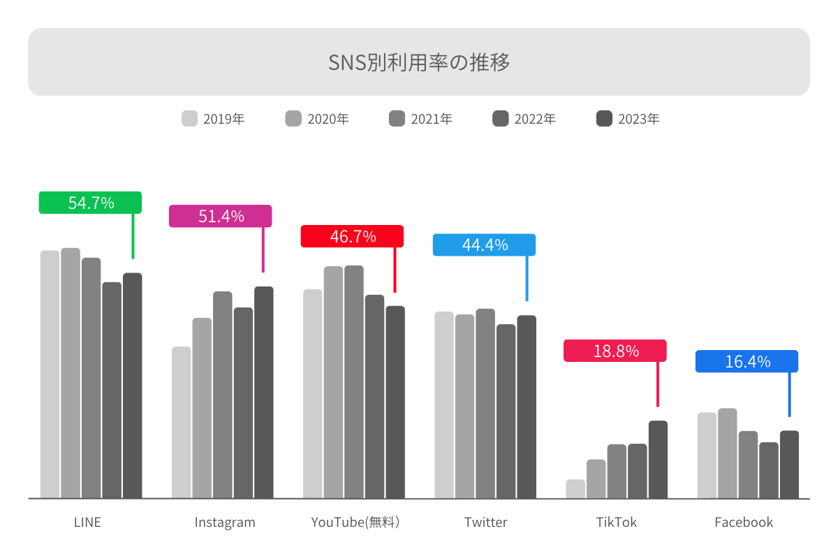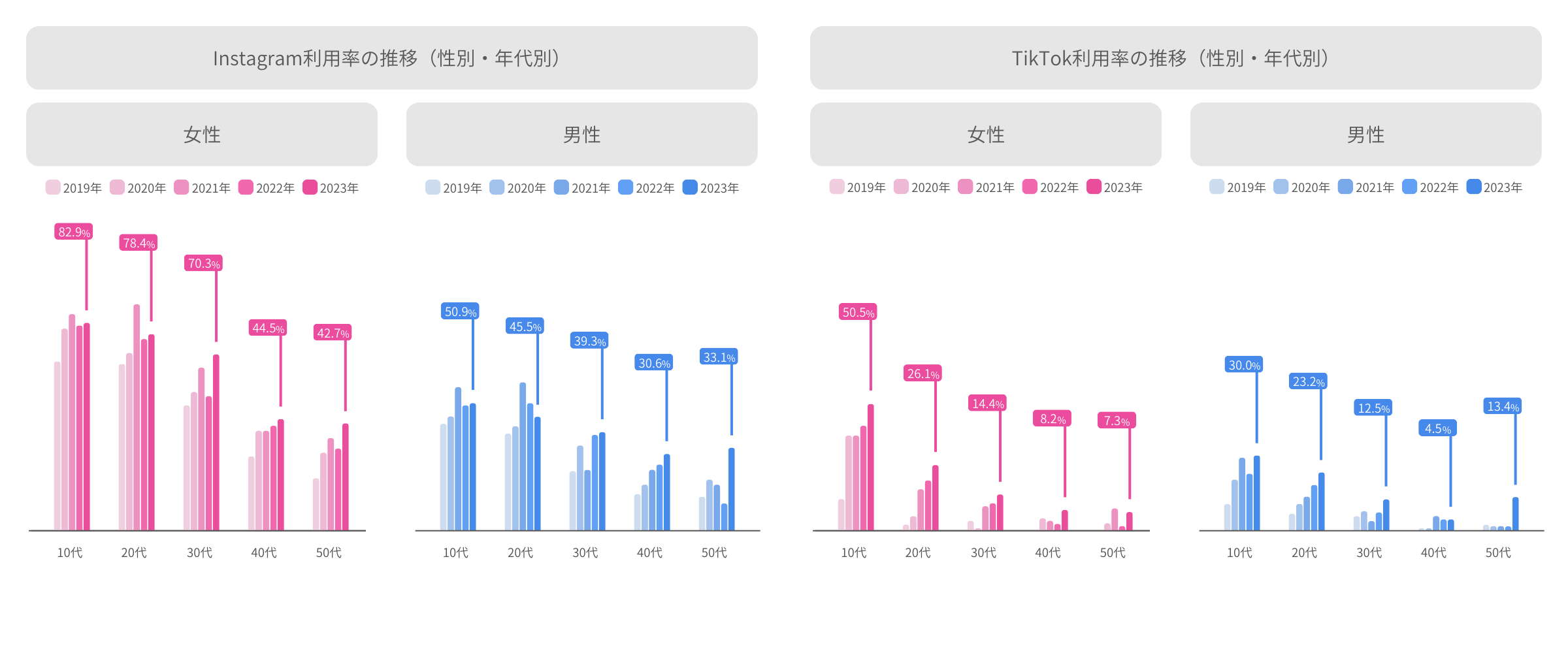 一方、SNS別利用率の推移では、「TikTok」は幅広い年代に支持され、利用率を伸ばした。「TikTok」は男性40代を除く全ての性別・年代で利用率が増加。「Instagram」は女性30代、50代、男性50代と比較的高い年代で利用率が伸びている。