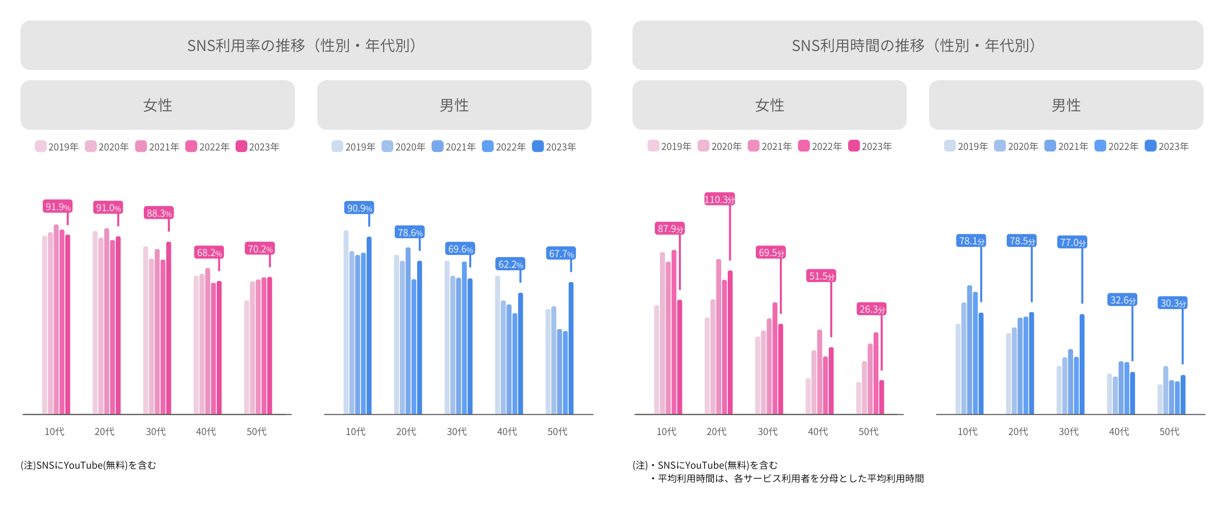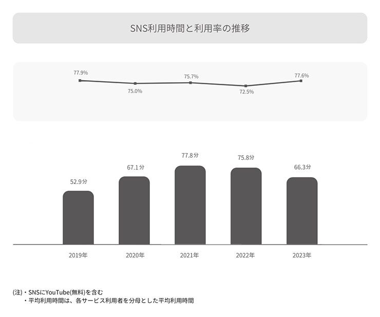 SNSの利用率は、2022年と比較して5.1ポイント上昇し、2019年の水準に戻った。また、15~19歳のSNS利用時間は大幅に減少。新型コロナウィルス感染症対策の緩和が進んだことに伴い、SNSからリアルコミュニケーションへ時間の使い方の変化が最も顕著に見られた年代だった。